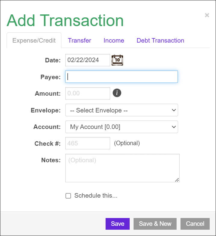 With your Envelopes filled, you can track your expenses and keep pace with your budget. When the next month rolls around, return to the Fill Envelopes page and distribute the next month’s portion.